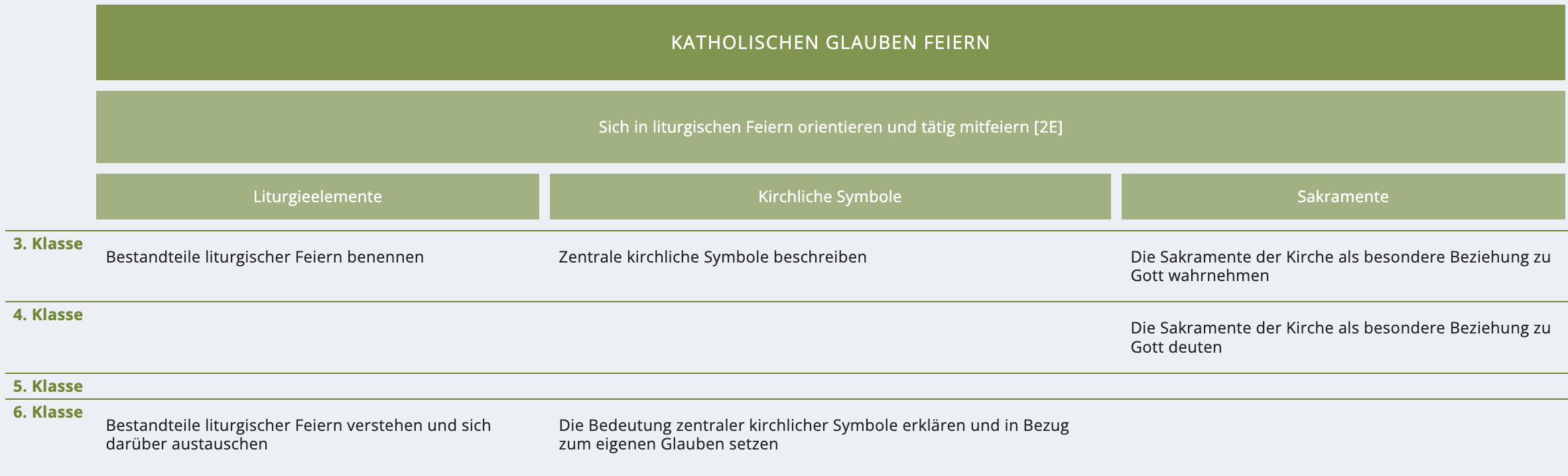 Ausgewählte Handlungsaspekte aus dem katechetischen Bereich sind für katechetisch Tätige der Katholischen Kirche im Bereich «Katholischen Glauben feiern» verortet und grün dargestellt (Beispielbild für Zyklus 2).