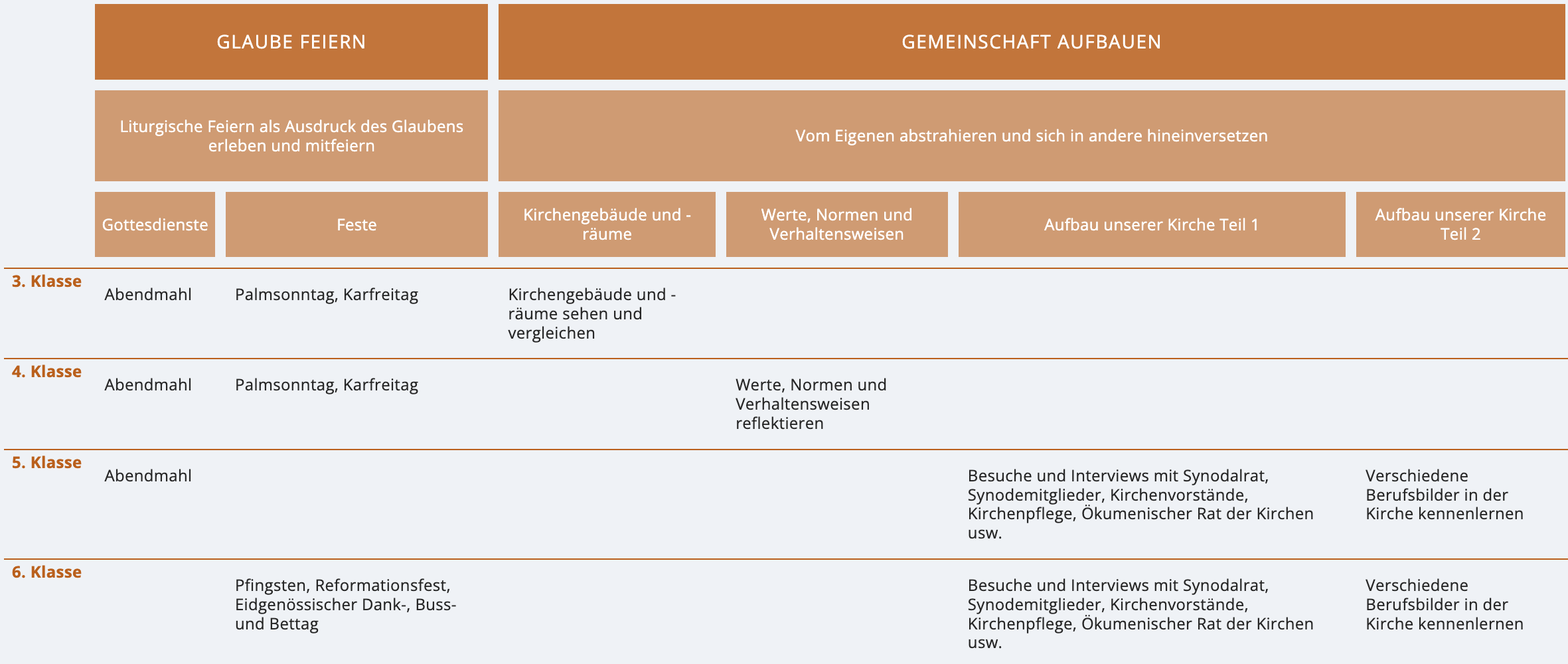 Ausgewählte Handlungsaspekte, welche für die reformierte Begleitung und Beheimatung der Kinder und Jugendlichen zentral sind, sind im Bereich «Glaube feiern und Gemeinschaft aufbauen» verortet und orange dargestellt (Beispielbild für Zyklus 2).